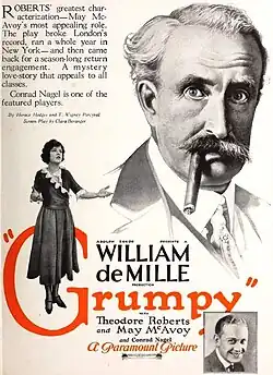 Grumpy is a 1923 American silent comedy drama film distributed by Paramount Pictures. It is based on a 1913 Broadway play Grumpy by Horace Hodges and Thomas Wigney Percyval and starred English actor Cyril Maude. The director of this film is William C. deMille, brother of Cecil, and the star is Theodore Roberts. This film was remade by Paramount as an early sound film for Cyril Maude reprising his Broadway role.[1][2]