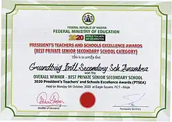 - ^ "Grundtvig Intl Secondary SCHL wins Presidential award, as overall best private SCHL in Nigeria". 13 October 2020.
