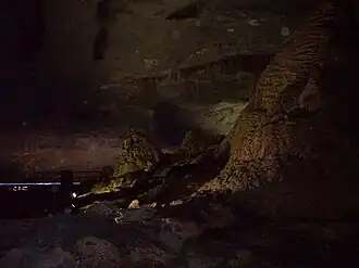 The geologic formation that the caves formed in is thought to have formed between 50 and 60 million years ago. During the prehistoric era, the caves were submerged in sea water that is the reason marine fossils like sea shells and snail shells can be seen on the cave walls. Bustamante caves like the García caves which were discovered a few years earlier, remained hidden for thousands of years until 1906.[1] The discovery of the Bustamante caves was in 1906 when a local peasant was looking for palmito plant in the Gomas mountains, when he realized there was a small hole in the top of the mountain, so he decided to dig until he could go into a cave and to his surprise he found a wide variety of stalactites and stalagmites inside.