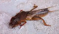 Gryllotalpa gryllotalpa, commonly known as the European mole cricket, is widespread in Europe and has been introduced to the eastern United States. Its scientific name is derived from the Latin 'gryllus' (cricket); and 'talpa' (mole), because of the fine dense fur which covers it and its subterranean habits,[2] and because of the mole-like forelegs adapted for digging, it's a good example of convergent evolution.