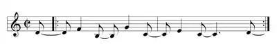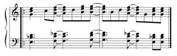 Most guajeos have a binary structure, with a specific alignment to the guide pattern known as clave. As Kevin Moore explains: "There are two common ways that the three-side is expressed in Cuban popular music. The first to come into regular use, which David Peñalosa calls 'clave motif,' is based on the decorated version of the three-side of the clave rhythm."[5] The following guajeo example is based on a clave motif. The three-side (first measure) consists of the tresillo variant known as cinquillo. Because the chord progression begins on the three-side, this guajeo is said to be in a three-two clave sequence.
