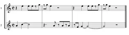 The moña consists of a two-measure module and its repetition, which is altered to reflect the montuno chord progression. The module begins with four ascending eighth-notes starting on the second [quarter-note of the measure]. This configuration emphasizes the ... two-side of the clave. In both of the modules, these four notes move from G3 to Eb4. Although the first, third, and fourth notes (G3, C4, and Eb4) are identical in both modules, the second note reflects the change in harmony. In the first module, this note is the Bb3 third of the tonic harmony; in the module repetition, the A3 is the fifth of the dominant. Of the final five notes in the module, the first four are [offbeats]; the final D4 is on the [last quarter-note] in the second measure of the module. Along with the final D4, the initial D4 on the [last offbeat] in the first measure of the module and the Eb4 on the [offbeat] immediately preceding the final note of the module are identical in both modules. The [offbeats] in the second-module measure reflect the harmonic changes. The first version of the module is over the dominant chord and contains the pitches A3 (the fifth) and C4 (the seventh). A Bb3 is sounded twice on the two [offbeats] in the module's repetition and represents the third G minor tonic chord.[10]