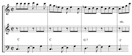 The following example is from the Congolese "rumba" "Passi ya boloko" by Franco (Luambo Makiadi) and O.K. Jazz (c. mid-1950s).[48] The bass is playing a tresillo-based tumbao, typical of son montuno. The rhythm guitar plays all of the offbeats, the exact pattern of the rhythm guitar in Cuban son. According to the Garland Encyclopedia of World Music, the lead guitar part "recalls the blue-tinged guitar solos heard in bluegrass and rockabilly music of the 1950s, with its characteristic insistence on the opposition of the major-third and minor-third degrees of the scale."[49]