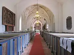 The main altarpiece of the church is from 1704, but the church also contains an altarpiece from the 1510s, displayed on one of the nave walls. It was most likely made in northern Germany. The baptismal font and the pulpit both date from the 17th century.[1]