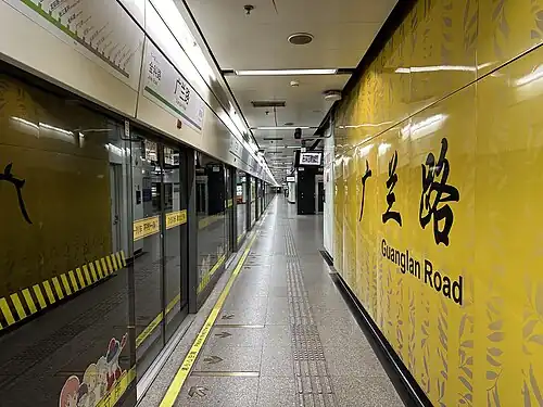 Guanglan Road (simplified Chinese: 广兰路; traditional Chinese: 廣蘭路; pinyin: Guǎnglán Lù) is an interchange station between Line 2 and Line 21 of the Shanghai Metro. The station is located along Zuchongzhi Road and is located between the stations of Tangzhen and the Jinke Road on Line 2. The station is located east of the intersection between Zuchongzhi Road and Guanglan Road, and has four exits. The station was opened on 24 February 2010, after Line 2 was extended from Zhangjiang High Technology Park.