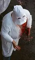 During the neighborhood Christian processions, several flagellanti ("flagellants") join in. They gently strike their backs with a metal discipline. On Sunday, the procession is joined by several hundred battenti ("beaters") who strike their chests with a spugna (literally "sponge," an instrument of penance made of a cork disk holding dozens of pins). Designated helpers pour white wine on the sponges during the procession, supposedly to ward off infection. There are a few dozen flagellanti during the Sunday procession, who also provide crowd control. The flagellanti and battenti are anonymous. They wear white hoods and are not even supposed to tell family members they are participating. Scourges and sponges are not carried openly or displayed in homes after the rite. The battenti are all men, although a few of the flagellanti are women.