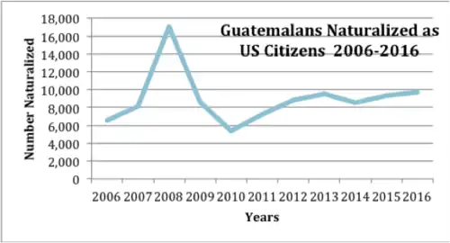 Very few Guatemalans have furthermore been granted citizenship. DHS data traces a range of about 6,500-9,700 Guatemalans granted citizenship annually since 2006.[9] In 2015, only 27% of the Guatemalans in the US were citizens.[10] Many Guatemalans, who are undocumented or on a temporary status, are blocked from a pathway to citizenship.[11] Facing immigration restrictions, such as the ceiling placed on relative-based immigration in the Immigration Act of 1990 and the massive amounts of border patrol that have increased through acts in 1996, 2001, 2005, and 2006, Guatemalans have predominantly had to enter the US without documentation.[12]