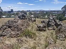 The area is today characterised by rocky outcrops and the remnants of an excavated pipe clay pit. From the time of their discovery by European settlers, the ironstone features were described as a gossan.[3] Surveys undertaken for the National Capital Development Commission in the 1980s described their formation approximately 425 million years ago during the Silurian period.[10] Subsequent investigation of the site indicate that the iron oxides instead cemented with soils on or close to the surface, combined with atmospheric and weather effects to form the outcrop. This is supported by many years of mineral exploration and drilling that found no gold or other minerals often associated with a gossan below the surface.[10]