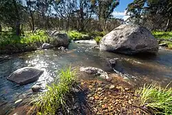Formed by the confluence of Bogong Creek and Middle Creek, the Gudgenby River rises within Namadgi National Park, below Yankee Hat and Mount Gudgenby, on the south-eastern slopes of the Brindabella Range in the south of the Australian Capital Territory (ACT). The river flows generally north and north-east, joined by nine tributaries, including the Naas River and Orroral River, before reaching its confluence with the Murrumbidgee River, near Tharwa. The river descends 422 metres (1,385 ft) over its 35 kilometres (22 mi) course.[1]