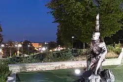 A sculpture of Lieutenant Colonel John McCrae by Ruth Abernethy was erected in the foreground of the Guelph Civic Museum in 2015. Lieutenant-Colonel John McCrae is shown, with his dress as an artillery officer and his medical bag nearby, as he writes. The statue shows the destruction of the battlefield and, at his feet, the poppies, which are a symbol of the memory of World War I and all armed conflicts since.[11]