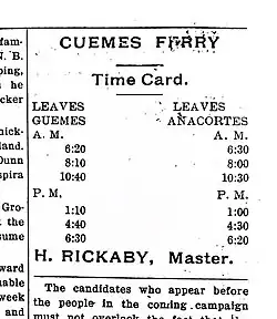 Guemes Island ferry schedule, published in 1912 in the Guemes Tillikum newspaper