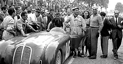 ![]() Bertocchi (center) in Piacenza with the Maserati A6 CS and driver Mario Angiolini, 11 May 1947 | |