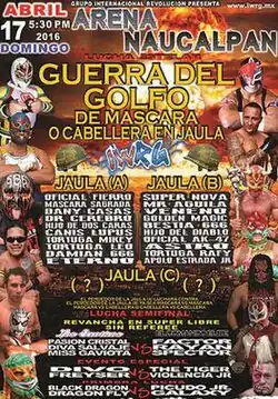 The Mexican wrestling promotion International Wrestling Revolution Group (IWRG; Sometimes referred to as Grupo Internacional Revolución in Spanish) has a long-standing history of holding major event focused on a multi-man steel cage match where the last wrestler left in the cage would be forced to either remove their wrestling mask or have their hair shaved off under Lucha de Apuestas, or "bet match", rules. In 2005 IWRG created a specific spring-time show promoting the steel cage match concept under the name Guerra del Golfo, or "Gulf War", referring to the Gulf of Mexico (not the Gulf War in the middle east).[2] The Guerra del Golfo shows featured two "qualifying" multi-man steel cage matches where the loser would later be forced to face off against each other in the main event of the show. In the final cage match the two wrestlers would wrestle where the loser would be forced to either unmask or, if they are not wearing a mask, have his hair shaved off. The use of the steel cage in three matches distinguishes the Guerra del Golfo event from other Steel cage matches held throughout the year such as the IWRG El Castillo del Terror ("The Tower of Terror"),[3][4] IWRG Guerra de Sexos ("War of the Sexes"),[5] or IWRG Prison Fatal ("Deadly Prison") shows.[6]