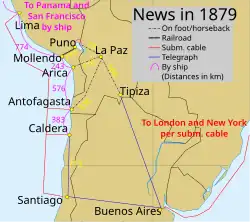 ![]() Sinking of the Esmeralda during the Battle of Iquique ![]() Map showing changes of territory caused by the War of the Pacific. Earlier maps from 1879 show different borders between Bolivia and Peru/Argentina. | |||||||||