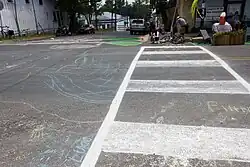 A guerrilla crosswalk is a pedestrian crossing that has been modified or created without jurisdictional approval, and with the intent of improving pedestrian and other non-automobile safety. These interventions are a common strategy within tactical urbanism, a type of low-cost, often temporary change to the built environment intended to improve local livability.[1] Guerilla crosswalks have been noted in news articles since at least 2009 and have become more well known as an urban strategy in recent years.[2] The first known example of guerilla crosswalks can be found in Canada in 1987 when social activists John Valeriote and Erik Veldman created a crosswalk in Guelph, Ontario for students to safely cross a busy road in front of their school.