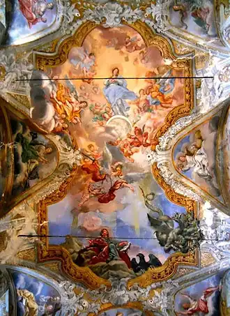 Guglielmo Borremans was quite unique in that as a Flemish painter who was not trained in the technique and art of fresco painting, he was able to establish himself as one of the leading fresco painters in southern Italy in the early 18th century. He may have learned the fresco technique from his master Pieter van Lint who during his time in Italy painted frescos in the Cybo-Soderini Chapel in the Basilica of Santa Maria del Popolo in Rome.[10] He also created works on canvas. Many of his works have been lost due to destruction caused by war and lack of adequate restoration. He also used a thinner wash of pigments than local painters which may have contributed to a quicker decay.[8]