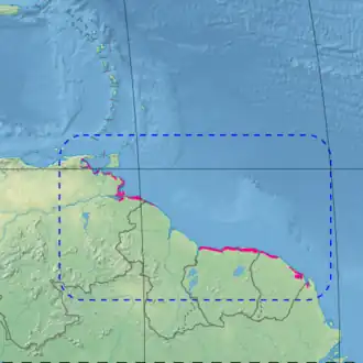 The Guianan mangroves ecoregion extends along the Atlantic coasts of northeastern Venezuela, Guyana, Suriname, French Guiana, and Cabo Orange in Brazil. It covers an area of about 14,500 square kilometres (5,600 sq mi) between the deltas of the Orinoco and Oyapock rivers. It includes the Gulf of Paria and the delta of the San Juan River. The largest part is in Venezuela in and around the Orinoco delta.[1]