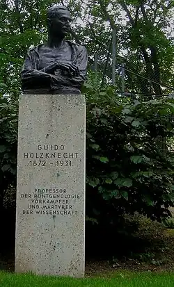 Guido Holzknecht was a pioneer in radiology. In 1902 he devised a color dosimeter (referred to as a "chromoradiometer") for detecting and measuring X-rays.[1] Like a number of other physicians in the early days of radiology, he died from the consequences of radiation poisoning in October 1931 aged 58. He was cremated at Feuerhalle Simmering, where also his ashes are buried.