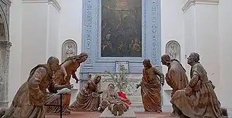 Mazzoni's best known works are a series of multi-figure depictions of the Lamentation (Compianto)[3] now in the Church of Gesù, Ferrara, and another in the church of Sant'Anna dei Lombardi in Naples. These realistic life-size figures are modelled in terracotta, for native stone was lacking in Modena, and subsequently painted. They represent emotive mourners gathered around the dead Christ, in which each character is a portrait of either the donor or a relative of the donor; in the Modena Lamentation, for instance, Ercole I d'Este represents Nicodemus and his wife Eleonor represents Mary of Cleophas. In the Neapolitan piece, Alfonso II is Joseph of Arimathea. It seems probable that Mazzoni's background in theatrical masks and props affected his work, because of the staged melodrama in their gestures and expressions. One attractive theory is that they relate to an annual passion play, in which these notable figures may have played some part.