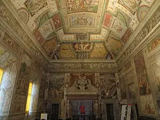 He was almost certainly born in the castle at San Secondo, the residence of his father Pier Maria II de' Rossi.[2] His mother was Pier Maria II's wife Antonia Torelli. Little is known of his youth: he served in the duke of Milan's army and in 1478 was made governor of Pontremoli and Lunigiana. He is known to have been a condottiero and man-at-arms in 1479.[3] In his will in 1464 Pier Maria II made Guido, his brother Bertrando and one of his illegitimate sons his heirs. This disinherited Pier Maria II's eldest son Giovanni.