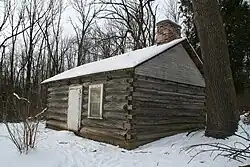 To the west of the Guild Inn property exists an 1800s-era log cabin, known as the Osterhout Log Cabin. The actual date of its construction is unknown. In 1795, surveyor Augustus Jones and his surveying team camped in the area and could have built a log cabin on the property while he surveyed Scarborough. However, Jones' accounts stated that they stayed in tents. In 1805, the property was granted to William Osterhout,[14] but there is no record of a log cabin during the time Osterhout lived on the property. The property was later owned by Alexander McDonnell, Duncan Cameron, and John Ewart. James Humphreys bought the property in 1845, and his son and family are the first recorded residents in the cabin, in 1861.[15] The property was bought by the Clarks in 1934.