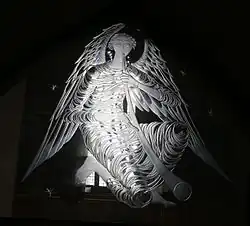 The angel on the top of the tower was given in memory of Sgt. Reginald Adgey-Edgar of the Intelligence Corps, who died on active service in 1944 during World War II.[6] It was designed by William Pickford and created by four silversmiths, before being positioned in Spring 1963. The supporting pole for the angel houses mobile phone antennas.[7]