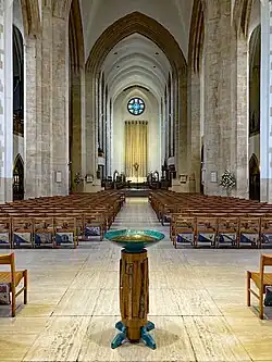 The cathedral contains fewer stained glass windows than many comparable church buildings, having a predominantly clear glazing scheme (using opaque glass to soften the light) to complement the modernist architectural style of the building.[9] However it includes works by Moira Forsyth, William Wilson, James Powell and Sons, Ninian Comper and Lawrence Lee.[10]