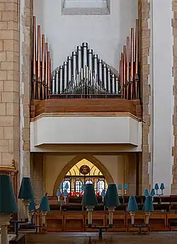 The cathedral organ was installed in 1961 by the Liverpool firm of Rushworth and Dreaper. It is a reconstruction of an organ dating from c. 1866, previously in the Rosse Street Baptist Church in Shipley, West Yorkshire.[13][14] The organ, probably built by Nicholson of Bradford, was a gift of the Coulthurst Trust. During the cathedral's renovation in 2015 to 2017, the organ was dismantled and refurbished by David Wells Organ Builders. There are approximately 4,600 pipes across both the main and positive organs.[15]