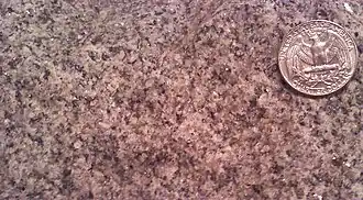 The Guilford Quartz Monzonite was described in 1898 as "perhaps the most attractive stone in the state" by Edward B. Mathews of the Maryland Geological Survey.[4] He provides this detailed description of the granite: