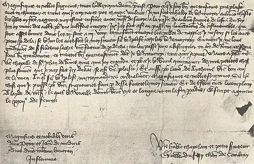 Modern scholarship generally spells the composer's surname as two words, 'Du Fay'.[6] Before the late 20th century, however, spelling the name as single word—'Dufay'—was much more common.[6] Archival discoveries from this period revealed that the surname was usually spelled as two words in documents of the 14th and 15th century, contrary to musical sources of that time.[6][9] It seems that Du Fay's parents spelt their surname as 'Du Fayt', but for unknown reasons the composer altered the spelling while active in Italy.[9] Documents from the composer's early years in Cambrai sometimes spelled his first name as Willaume, or a related form such as Willermus, Willem or Wilhelm.[10]