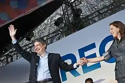 In early 2017, Lasso launched his second presidential campaign to succeed incumbent President Correa for the conservative Creating Opportunities party in the 2017 presidential elections.[9] His campaign's theme was one of "change" and he pledged to create one million jobs in Ecuador.[44] Lasso received 48.84% and lost to Lenín Moreno.[9] Following the result, Lasso accused his opponents of electoral fraud and called the incoming administration "illegitimate".[9]