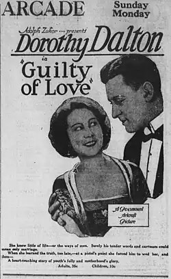 Guilty of Love is a 1920 American silent drama film directed by Harley Knoles and written by Rosina Henley who adapted the play by Avery Hopwood. The film stars Dorothy Dalton, Julia Hurley, Henry Carvill, Augusta Anderson, Edward Langford, and Charles Lane. The film was released on August 22, 1920, by Paramount Pictures.[2][3]