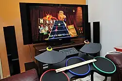 World Tour features a wireless six-piece drum kit, with a bass drum pedal and five velocity-sensitive drum pads, which Activision has stated provide the "most realistic drum experience ever in a video game".[7][11][12][21][25] Generally, the pads represent the snare drum (red), the tom-tom drum (blue), the floor tom (green), the hi-hat cymbal (yellow), and the crash cymbal (orange), however, they can be used for other percussion instruments depending on the song. The bass drum is represented by a purple, horizontal line on the highway, which players must use the drum pedal to hit. The drum kit was designed with help from John Devacka, the developer of MTV Drumscape, and developed key patents used for most modern music games that are now owned by Activision.[11] Special note gems on the drum track, representing accent notes, are "armored", requiring the player to strike the corresponding drum head harder in order to break the armor and score more points. During song creation, the velocity sensitivity feature of the drum pad allows players to alter the sounds made by the drums.[21] The drum set also has a MIDI input port in the back, allowing users to connect a compatible MIDI drum kit to play in the game.[26] The Wii version of the drum controller includes a slot for the Wii Remote to fit into, enabling it to become wireless, much like the guitar controller introduced for the Wii version of Guitar Hero III.
