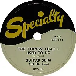 Eddie Jones (December 10, 1926 – February 7, 1959),[1] known as Guitar Slim, was an American guitarist in the 1940s and 1950s, best known for the million-selling song "The Things That I Used to Do", for Specialty Records.[1] It is listed in the Rock and Roll Hall of Fame's 500 Songs That Shaped Rock and Roll.[2] Slim had a major impact on rock and roll and experimented with distorted tones on the electric guitar a full decade before Jimi Hendrix.[3]