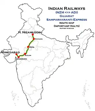 The Gujarat Sampark Kranti Express runs three days a week. As of 1 November 2009, 2917 departs ADI every Monday, Wednesday and Friday at 1720 and arrives at NZM at 1040 on Tuesday, Thursday and Saturday, averaging 65 km/h speed during its run. 2918 departs NZM every Tuesday, Thursday and Saturday at 1355 and arrives at ADI at 610 on Wednesday, Friday and Sunday, averaging 69 km/h speed.[1] In its journey, the train passes through the Indian states of Gujarat, Madhya Pradesh, Rajasthan, Uttar Pradesh, Haryana and Delhi. Some cities where the Gujarat Sampark Kranti Express halts en route are Nadiad, Chhayapuri (Vadodara), Godhra, Dahod, Ratlam, Kota and Mathura. The entire route of the train is on double-line electrified track section of Indian Railways.