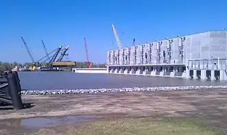 On March 6 & 10, 2011, installation Archived 2011-07-14 at the Wayback Machine of the 653 ton ea. sector gates was completed.