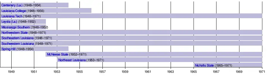 | Nicholls State University | Colonels | Thibodaux, Louisiana | 1948 | Public | 1965 | 1971 | Southland (NCAA Division I) |