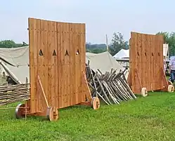 The use of term gulyay-gorod is noted in sources from the 1530s, during the Russo-Kazan Wars, and it was understood not only as a type of wagon-fort, but also as siege towers. Later, this term could cover mobile barriers like the cheval de frise. It was probably just an adaptation of the German term "wagenburg". At first, it was used to cover artillery during the siege of fortresses. In 1572 gulyay-gorod was very successfully used by the commander Prince Mikhail Vorotynsky in the heavy field battle of Molodi. So in the following years, the use of gulyay-gorod expanded, and pre-made shields were stored not only in the border fortresses, but also near Moscow. For the transportation and equipment of Gulyai-gorod, a special voivode was appointed, who had a separate cavalry detachment for reconnaissance.[1] Giles Fletcher, the Elder, English ambassador to Russia, left an early Western description of the gulyay-gorod in his Of the Russe Common Wealth (1591).