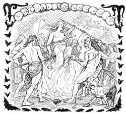 Gullveig is solely attested in a stanza of Völuspá (Prophecy of the Völva) immediately preceding the story of the Æsir–Vanir War.[4] A völva (seeress) recalls that Gullveig was pierced by spears before being burnt three times in the hall of Hárr (one of Odin's names), and yet was three times reborn. Presumably after her burning, Gullveig became known as Heiðr, a knowledgeable völva who could perform great feats: