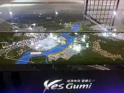 Gumi (Korean구미; Korean pronunciation: [ku.mi]) is the second largest and most densely populated city in North Gyeongsang Province, South Korea. It is located on the Nakdong River, halfway between Daegu and Gimcheon, also lies on the Gyeongbu Expressway and Gyeongbu Line railway which are the principal traffic routes of the country.