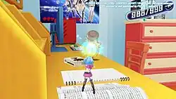 The world view is that of a small alien sneaking into a human girls' dormitory to observe their private lives, thus is set in a relatively large game environment. The player is able to look at the girls from a "doll-sized perspective" at various angles.[2] There are various goals in the gameplay such as collecting coins while avoiding being seen by the human girls; when the player fails to find the necessary information for the mission, they will be tasked to shoot at the humans with "happy bullets", which raise the endorphin levels of the human victim, depending on each body part targeted.[3] At the end of every chapter is a Maiden Suppression Battle.[4]