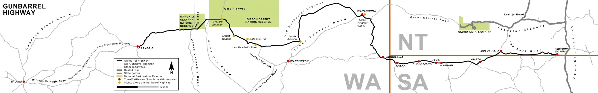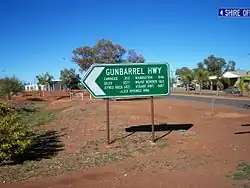The Gunbarrel Highway is an isolated desert track in the Northern Territory, South Australia and Western Australia.[4] It consists of about 1,350 km (840 mi) of washaways, heavy corrugations, stone, sand and flood plains. The Gunbarrel Highway connects Victory Downs in the Northern Territory to Carnegie Station in Western Australia.[5] Some sources incorrectly show the highway extending west to Wiluna.[6]