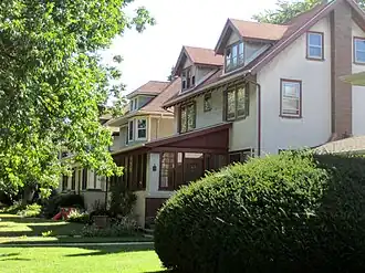 The Gunderson Historic District is a residential historic district in southern Oak Park, Illinois. The district encompasses 230 residential buildings built between 1906 and 1920, the vast majority of which are single-family homes. The development was the second of two built in Oak Park by S.T. Gunderson and Sons, a housing company which mainly worked in Oak Park and the West Side of Chicago. The firm commissioned architect Frank DeMoney to design their Oak Park houses; most of his designs used the American Foursquare style, a simple style which could be executed affordably. DeMoney differentiated the houses by applying elements of other contemporary architectural styles, such as Arts and Crafts, Colonial Revival, or Prairie School. The uniform design and layout of its homes made the district an early example of tract housing, which would become much more widespread later in the twentieth century.[2]