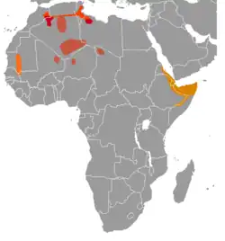 Gundis or comb rats are a group of small, stocky, African rodents in the family Ctenodactylidae. They live in rocky deserts across Northern Africa. The family comprises four living genera and five species (Speke's gundi, Felou gundi, Val's or desert gundi, common or North African gundi and Mzab gundi), as well as numerous extinct genera and species.[1] They are in the superfamily Ctenodactyloidea. Local people in northern Africa have always known about gundis, however they first came to the notice of western naturalists in Tripoli in 1774, and were given the name gundi mice.[2] While they are not regarded as pests, some people hunt gundis for food.[3]