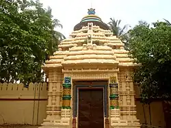 The temple is built using light-grey sandstone and architecturally, it exemplifies typical Kalinga temple architecture[2] in the Deula style. The complex comprises four components: vimana (tower structure containing the sanctum), jagamohana (assembly hall), nata-mandapa (festival hall) and bhoga-mandapa (hall of offerings). There is also a kitchen connected by a small passage.[3] The temple is set within a garden,[2] and is known as "God's Summer Garden Retreat" or garden house of Jagannath.[4] The entire complex, including garden, is surrounded by a wall.