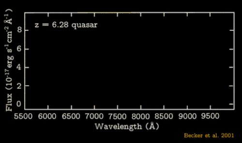 For over three decades after the prediction, no objects had been found distant enough to show the Gunn–Peterson trough. It was not until 2001, with the discovery of a quasar with a redshift z = 6.28 by Robert Becker and others[3] using data from the Sloan Digital Sky Survey, that a Gunn–Peterson trough was finally observed. The article also included quasars at redshifts of z = 5.82 and z = 5.99, and, while each of these exhibited absorption of photons with energies just above that of the Lyman-alpha transition (or, wavelengths just to the blue side of the transition), there were numerous spikes in flux as well, indicating having traversed pockets of space with negligible neutral hydrogen. The flux of the quasar at z = 6.28, however, was effectively zero at energies just above that of Lyman-alpha transition, meaning that the neutral hydrogen fraction in the IGM must have been larger than ~10−3.