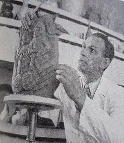 From the mid-1940s, Nylund devoted much of his time to reliefs and other work for the decoration of public spaces, for example the “Theater¬ Cavalcade” at the Malmö Stadsteater, “The Jungle Awakens” now found at the entrance of the library of the University of Agriculture in Uppsala, the “Three Västgöter”, relief for the Västgöta nation Uppsala, “Life in the square” for Lidköping's Sparbank, “Our Times” relief for the Göte-borgsposten, “Symfonica” relief for the m/s Gripsholm ship, as well as altarpieces, etc., for the Lidköping crematorium, the altar of Skara cathedral and the “Thorn of Crowns”. He also created sculptures such as “St. George and the Dragon” for the National Institute of Arts and Crafts and the “Mermaid” fountain for the National Museum in Stockholm in 1943, a work that has been moved to the Rörstrand museum in Lidköping, where other reliefs such as “The oven is empty” are found.