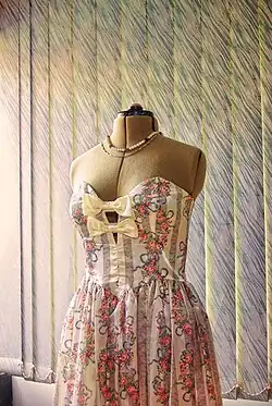 From the 1980s onward, Gunne Sax dresses tended to follow modern prom dress sensibilities, such as tight, strapless bodices and full skirts, favoring fabrics like satin, taffeta, and tulle. In 1999 taffeta was the number one seller paired with matte satin or brocade corsets, with an addition of skirts made in tulle or dotted swiss.[5]