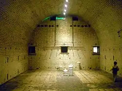 In 1668, following the Dutch Raid on the Medway, Upnor Castle was reassigned from serving as an artillery fort to be 'a Place of Store and Magazine'. Thenceforward, barrels of gunpowder were transferred to Upnor, primarily from the Tower of London. The castle was recognized as unsuitable for this role as early as 1808 when a new magazine (since demolished) was built on an adjacent site; another, of similar design, was added in 1857.[29] The latter, which still stands, is described as 'a particularly fine magazine building of the 1850s, distinguished by its historicist style' and 'the most impressive example of a magazine using the catenary arch system'.[30]