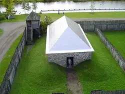 The No. 2 magazine was built by the Board of Ordnance and is the oldest magazine. It is 29-foot (8.9 m) long by 28-foot (8.6 m) wide. It has a groin-vaulted roof. The magazine is protected by earthen banks on two sides; with doors at both ends. The No. 1 magazine is newer; and was built sometime after 1828. It is 80-foot (24.5 m) long by 25-foot (7.6 m) wide and has solid walls, but is now roofless.[1]